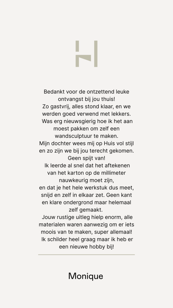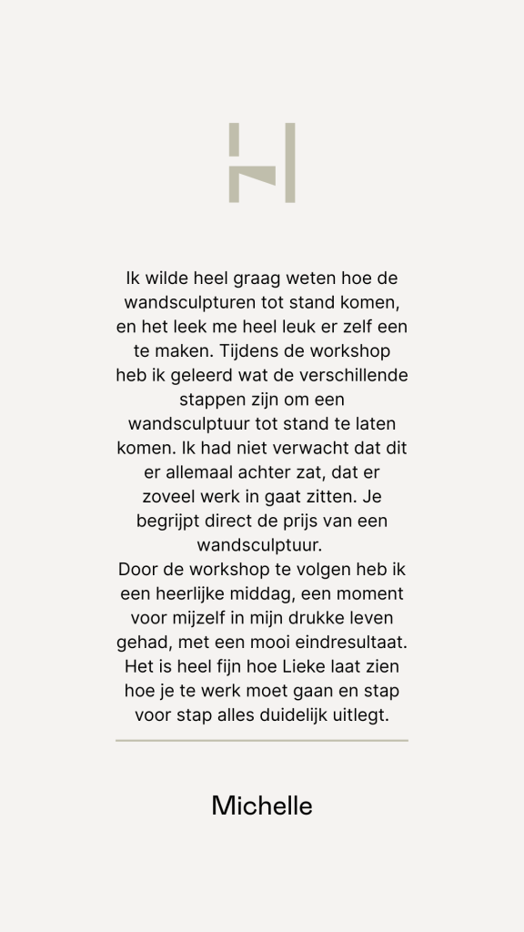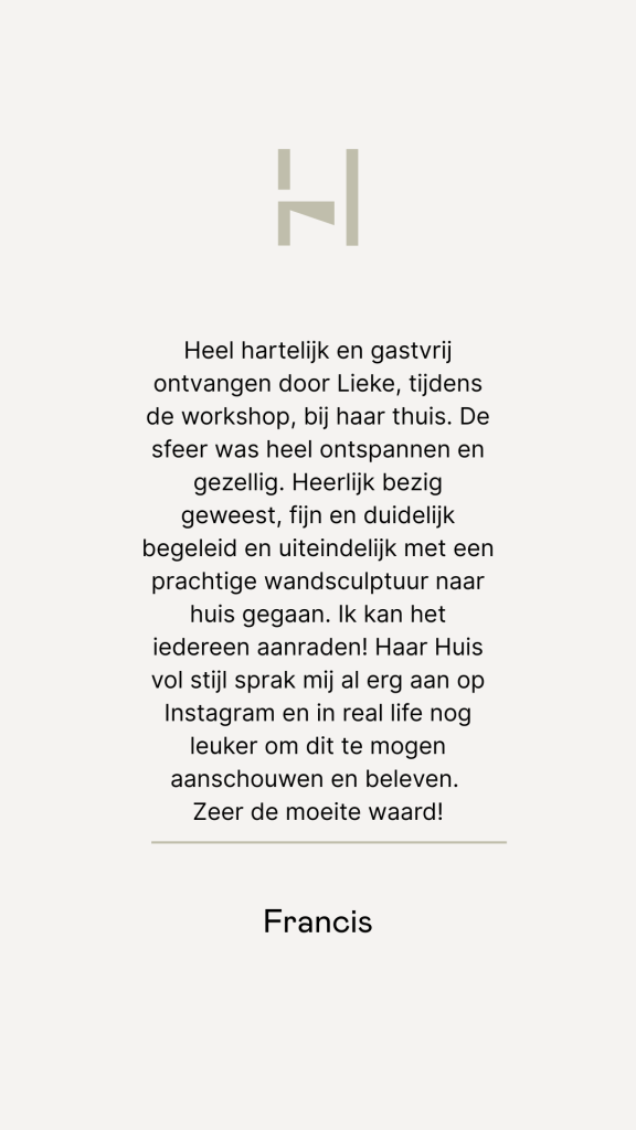 Lieke ontwerpt en creëert onder het label Huis vol stijl handgemaakte wandsculpturen. Ze deelt haar passie en expertise graag met anderen door zowel enthousiaste doe-het-zelvers als deelnemers van workshops te begeleiden in het maken van hun eigen of gezamenlijke wandsculptuur. Of je nu alleen -online- vanuit huis of in een groepssetting zit, of je nu beginner bent of ervaring hebt, iedereen kan de magie van het maakproces ervaren.