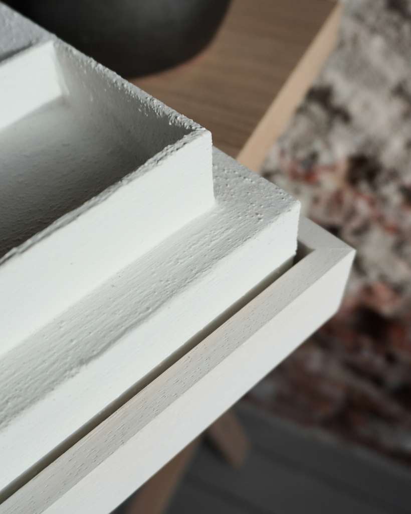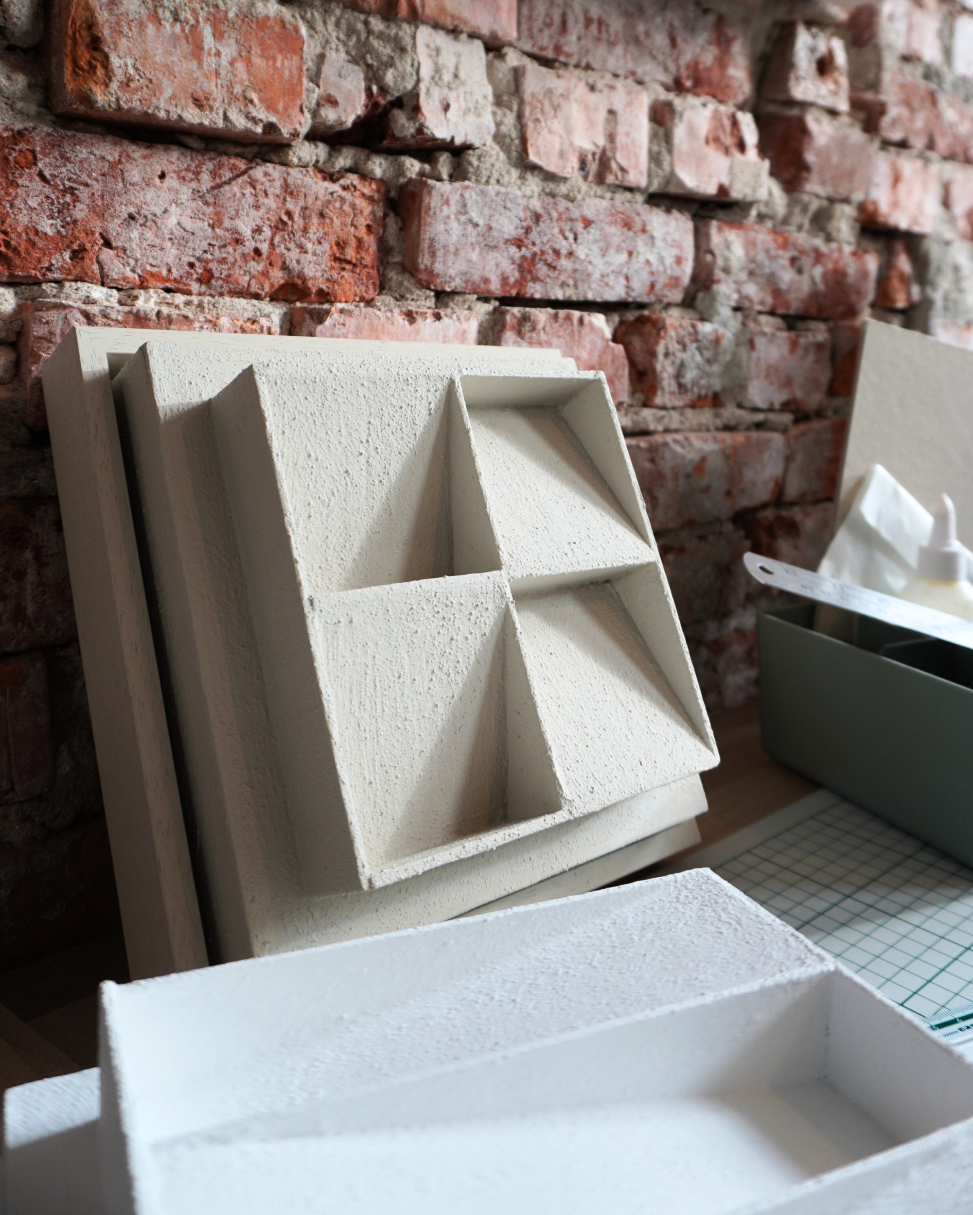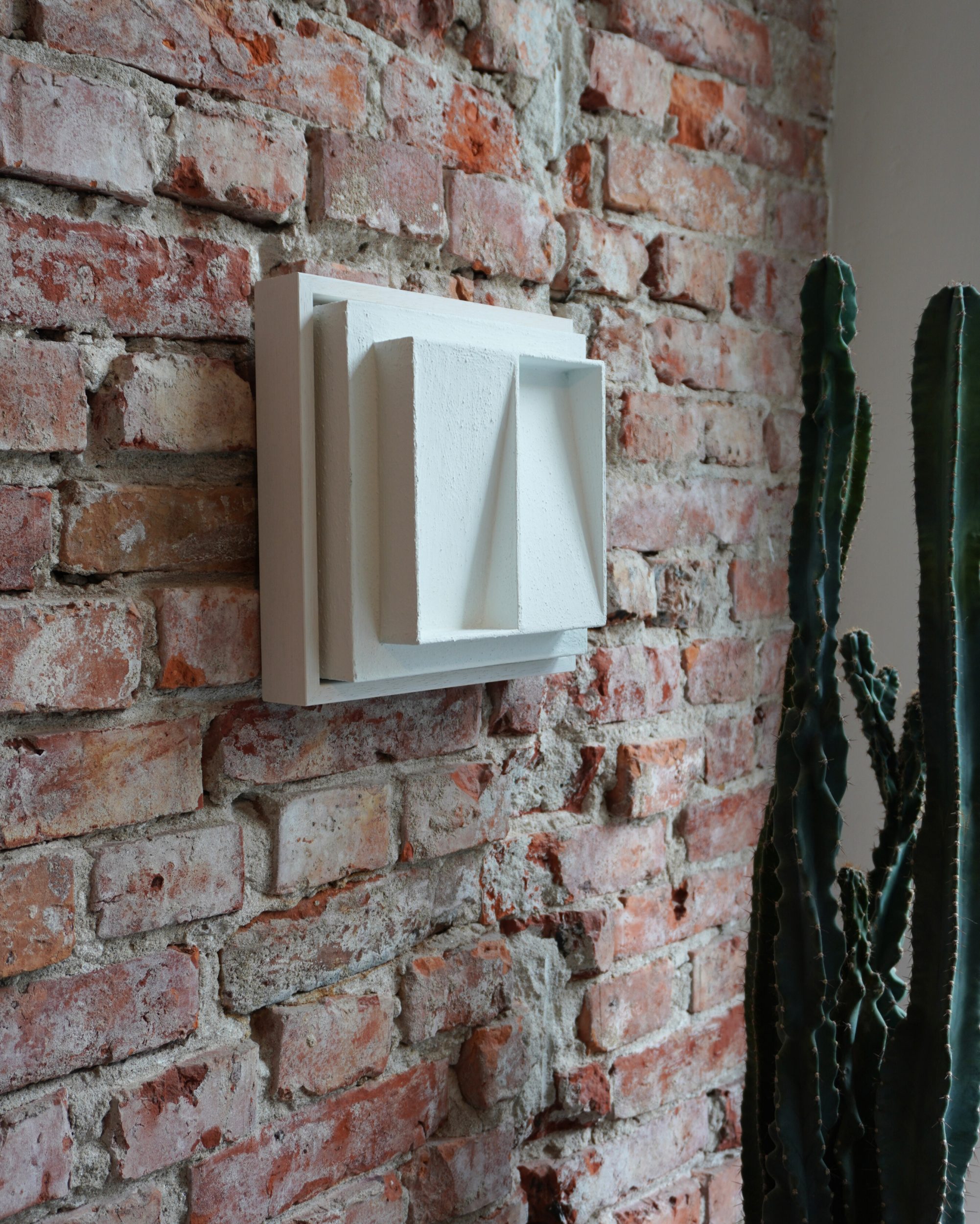 Geïnspireerd door het werk van kunstenaar Jan Schoonhoven en vanuit mijn fascinatie voor architectonische constructies in combinatie met het spel van licht in een ruimte maak ik de wandsculpturen. Ruimtelijke schilderijen die letterlijk spelen met het licht. Mijn herinnering aan architectonische constructies laat ik spreken door een combinatie te maken van bestaande constructies uit de tastbare werkelijkheid en mijn eigen fantasie.